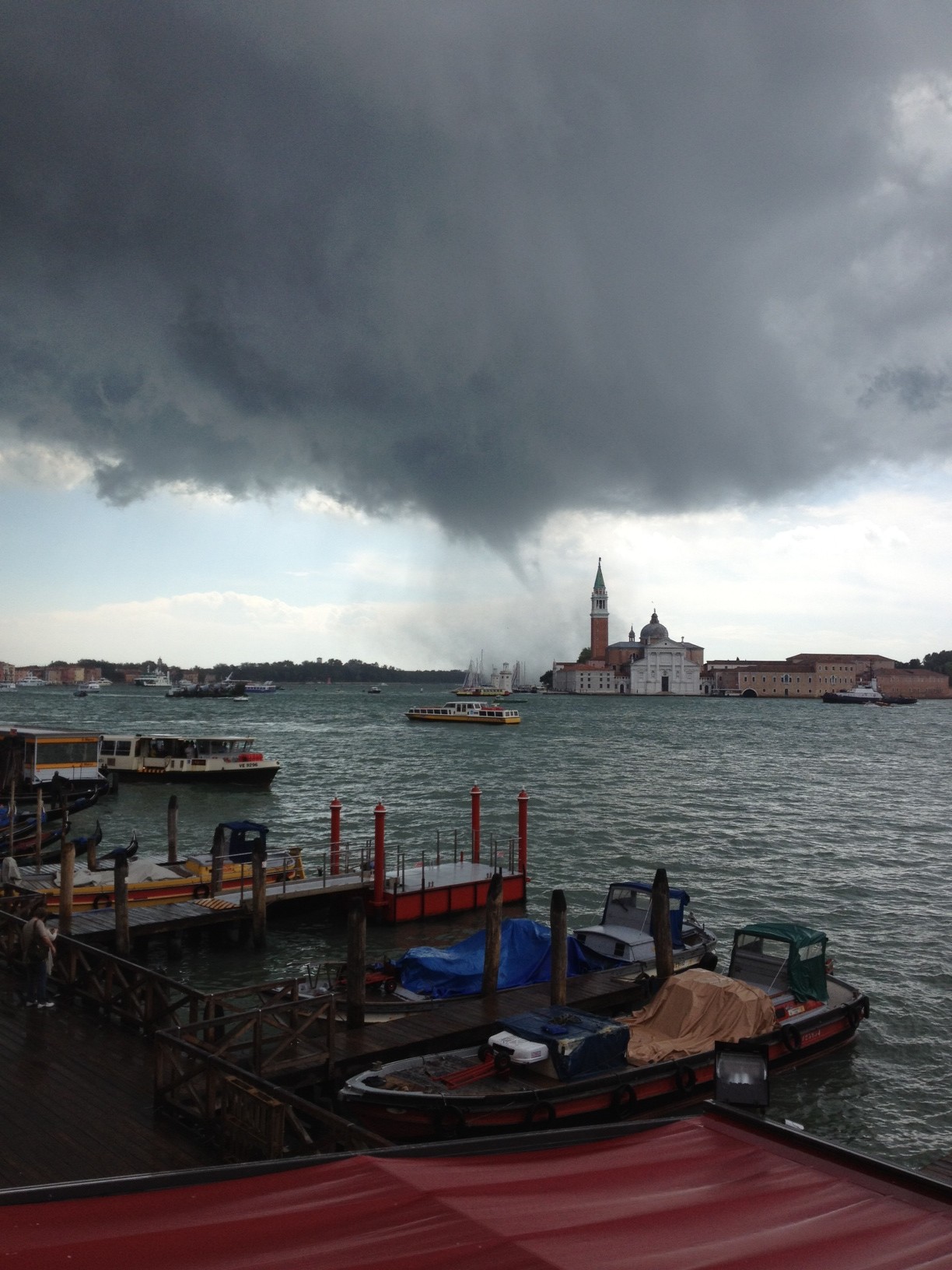 Mercifully as it hit the Guidecca island it slid to our left along the lagoon, running between us and the Lido, becoming a waterspout before our amazed eyes, touching down on the water and sucking up huge masses of material. Up on the roof terrace we watched it tear into the Botanical Gardens where Tania took pictures and video footage.